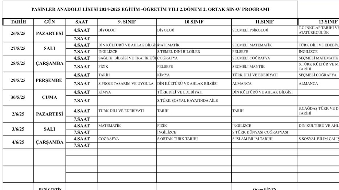2024-2025 EĞİTİM-ÖĞRETİM YILI PASİNLER ANADOLU LİSESİ II. DÖNEM II.ORTAK YAZILI SINAV TAKVİMİ